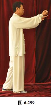 接上式,腰微含,收回蹬出的右脚落于右前方。腰微含右转, 重心回至左腿,左膝微弓,右掌变拳,左掌同向右下划弧回撤,收至右侧胯旁。左手掌搭于右手腕部,向右前下打挤;腰微上提 两臂向前向左向里划弧,右拳拳心向上,左掌心向下,运划至右膝前, 两手与右膝成三角形,重心渐渐移于右腿;腰微拱,随之微向右转, 随转体,右拳自右肋旁而上经胸前向前搬出。随搬臂外旋,使拳心慢慢翻转朝上,随即渐渐向下弧形收回。左掌同时随转体,划弧向右经右臂里侧前拦;左腰微提,左脚前上一步,同时腰微含向右转, 身体继续右转,随转体,左掌向前探出。腰微拱,右拳划弧收回腰肋旁,拳心朝上。随着腰上提向左转,重心渐渐移于左腿,成左弓步。同时身体渐渐左转,随转体,右拳向前打出,拳眼朝上。左手指尖朝前上,置于右小臂内侧,眼向前平视(见图6-298至6-302)。