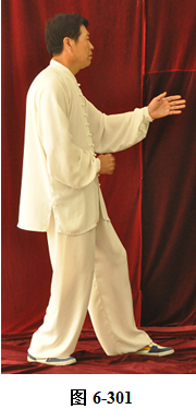 注意:步法和手法要随腰转动,右拳打出时,拳要虚拢,内劲要跟随,不可用拙力,连续进步,速度要均匀。