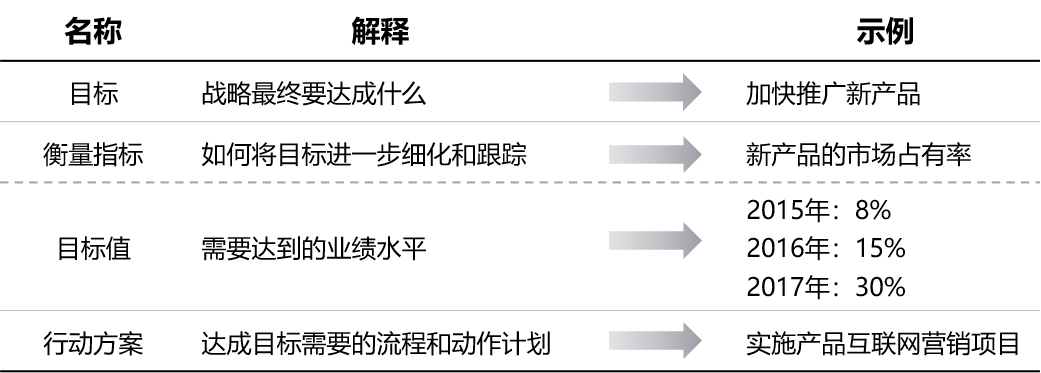 平衡计分卡的核心要素包括战略目标/战略主题、衡量指标、目标值、行动方案等。如图6-9所示。