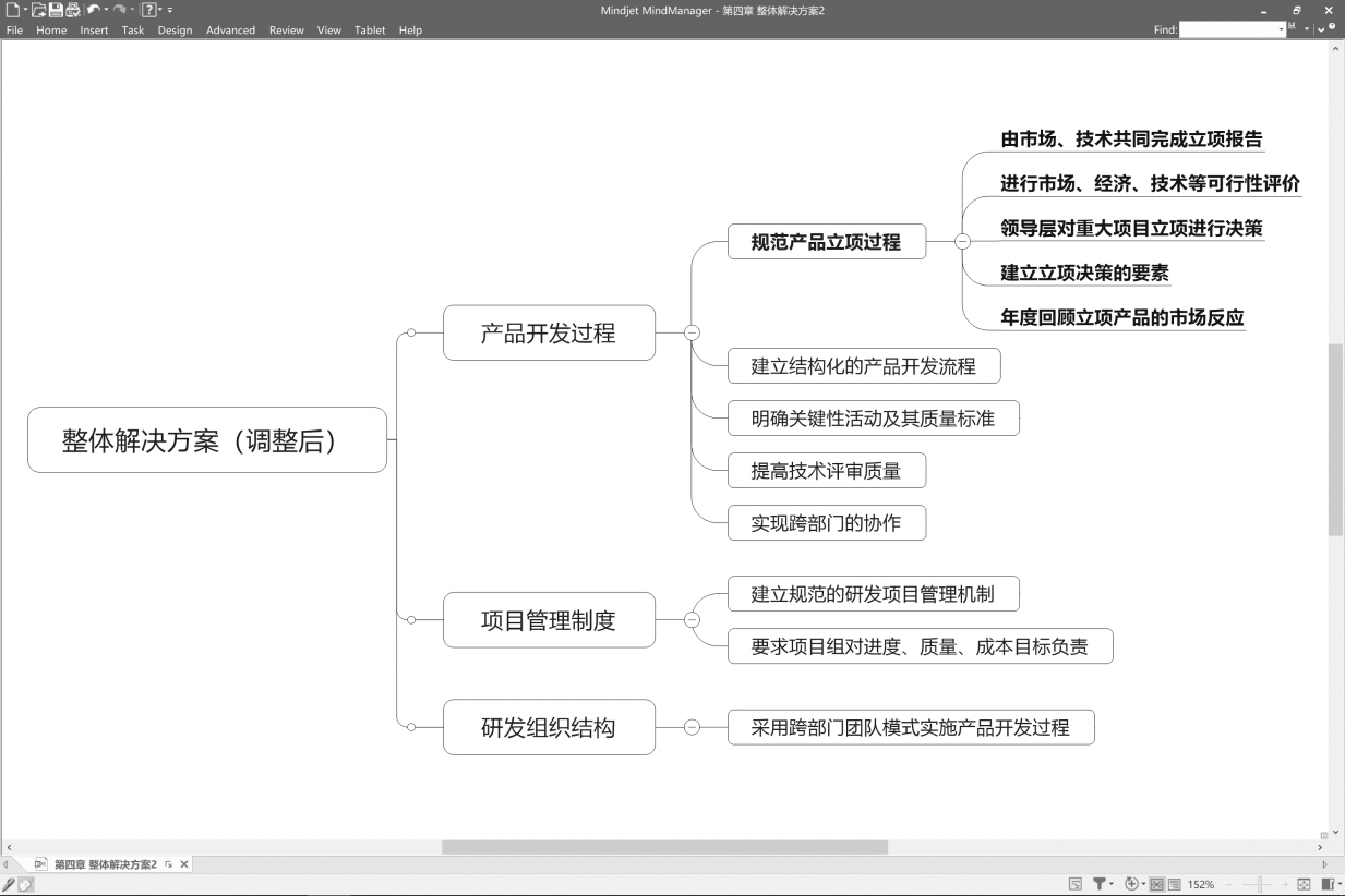 综合考虑上述因素,将初步解决方案中“产品规划”部分去掉,同时强调了“项目立项”工作。这样,在不降低改进目标的前提下,考虑到企业现状,简化了解决方案及其操作难度。如图4-7所示。