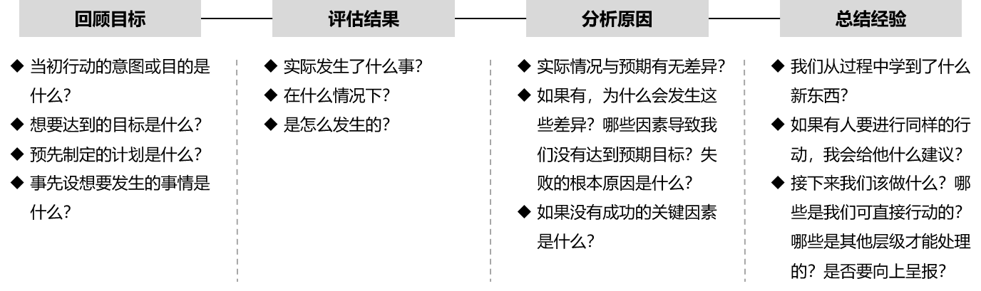 复盘是一种工作方式,也是员工学习的方式,让员工在复盘中成长。如图7-5、表7-2、表7-3所示。