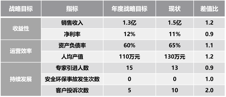 以PDCA分析法为例,某矿业企业根据战略目标,选取了以下几个重点指标进行现状和目标对比,如表7-4、图7-10所示。 表7-4 某矿业企业现状和目标对比 图7-10 某矿业企业差值比 第一步:在战略目标中,该矿业企业客户投诉次数年度的战略目标值偏离度较大,客户投诉次数是衡量在营销过程中,客户服务质量的关键指标。 第二步:用因果图分析原因及根本原因确认,如图7-11所示。 图7-11 因果图 第三步:拟定措施、制定计划,如图7-12所示。 图7-12 拟定措施、制定计划 第四步:执行措施、执行计划,如表7-5所示。 表7-5 执行措施、执行计划 第五步:检查验证、评估效果。 达成结果:客户投诉次数降为1。 第六步:标准化,固化成绩,并处理遗留问题,如表7-6所示。 表7-6 标准化,固化成绩 以雷达图分析法为例,某企业从收益性、安全性、流动性、成长性、生产性五个维度选取了15个指标,企业本年度的战略目标值和实际完成值如表7-7所示。 表7-7 企业本年度的战略目标值和实际完成值 第一步:算出对比值比例,方便作图,用企业实际值/企业战略目标值,得出对比值。 第二步:画出三个同心圆作为坐标系,最小圆代表战略目标的1/2,或最低水平;中间圆代表战略目标(即标准线),最大圆代表战略目标的1.5倍。 第三步:在每个指标区域内,从圆心画出射线,作为指标线,并标出名称及标度(标度由该经营比率的量纲与战略目标决定)。 第四步:将每个指标的对比值,以点标在图上,以线段依次连接相邻点,形成的多边形折线闭环。 第五步:依据雷达图,对企业展开分析。可以看出,企业的收益性接近战略目标。安全性中,利息保障倍数与战略目标偏离度较大;流动性均接近战略目标;成长性中,净利润增长率与战略目标偏离度较大;生产性中,人均资产总额、人均销售收入与战略目标偏离度较大。整体来看,企业的成长性和生产性最需加强。如图7-13所示。 图7-13 某企业雷达图 通过会议研讨和工作回顾,根据行业发展状况和公司现状,该企业提出了减员增效、加强销售渠道建设两项大的战略调整举措,以期在未来达到战略目标。 |