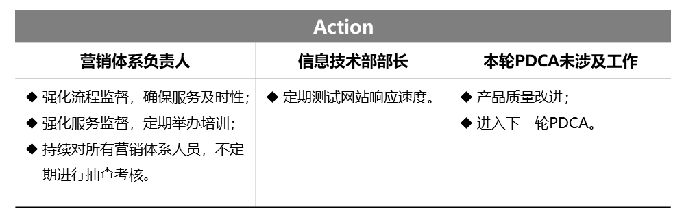 A(Action)——行动,对总结检查的结果进行处理,成功的经验加以肯定并适当推广、标准化;失败的教训加以总结,以免重现,未解决的问题放到下一个PDCA循环。