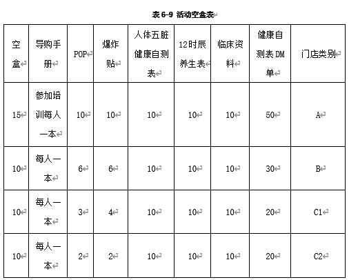 1.活动执行,行动队到每个门店进行拜访,活动POP宣传,门店进行活动创意POP手绘(确保每个门店有2张以上); DM折页放置,顾客随手可以拿得到;以下物料落实到位情况,每个门店有实际货物陈列,并且空盒不低于10个(见表6-9), 空盒由店长陈列到位,在超级导购训练营开班前,凡是将陈列图片发给供货方地通过的,每位店长发3小盒某中成药。片区经理或者运营部监督到位95%以上者奖励原品一提或者6小盒。奖励在培训时统一发放。