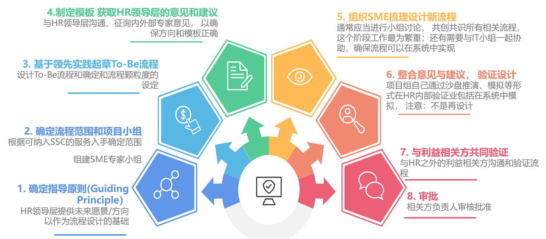 流程设计在HR部门建设中属于比较核心的建设板块,因为流程反映了组织也反映了政策,并指导我们的日常工作。它的重要性特别体现在SSC共享服务中心的工作中,同时明确了相关角色在日常工作的具体职责和任务,对于避免职责不清非常重要,高质量的流程可大大提高HR的配合效率。