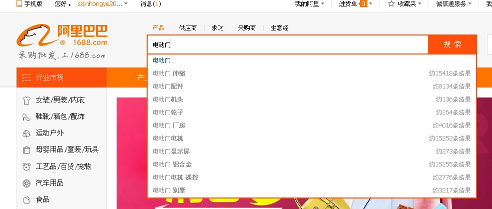 我们在阿里巴巴主页输入关键词“电动门”,就会看到下拉框里有很多和关键词对应的词,如图6-1所示。这些词有不少是我们需要的,因为这些词是阿里巴巴根据用户搜索习惯、搜索次数等基数积累而来。