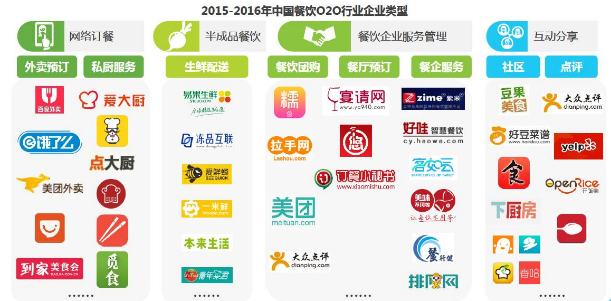 餐饮O2O:餐饮交易与服务同时涉及线上流程(包括但不限于支付、下单等)和线下实体服务或体验。包括:商家通过让利,吸引消费者在线下下单,然后线下消费;以菜谱为切入点建立社区,锁定目标用户,通过平台自身的用户黏度,引导用户完成线上下单的交易闭环;餐饮商户将产品通过外送的方式销售出去的外卖服务;为餐饮企业提供软件工具类产品服务等。