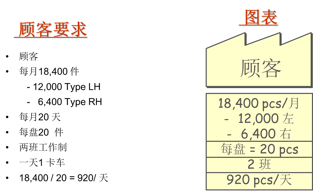 装配厂采用两班制,这个顾客每月使用18400件转向盘支架并要求每天送货。一般每月需要1200件“左置”支架和6400件“右置”支架。要求一只周转箱内放20个支架,每一个集装箱最多放10个周转箱。
