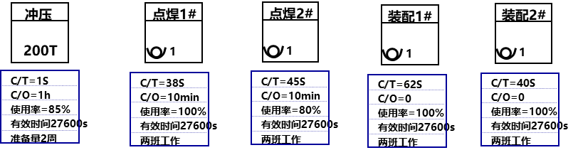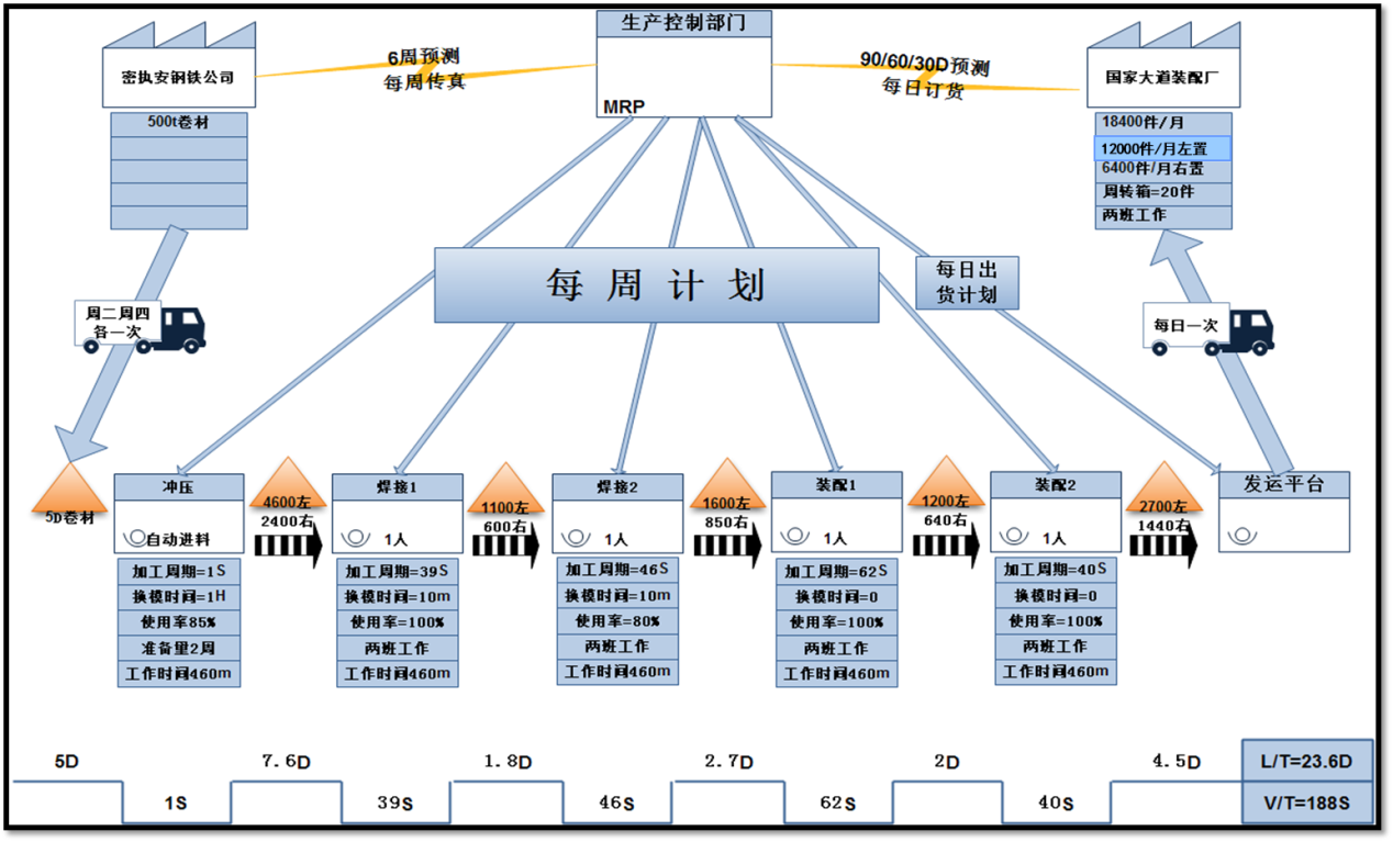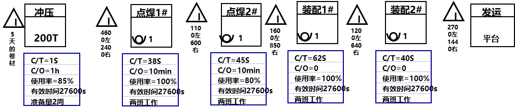 材料流的绘制在图的下半部分由左向右进行。在该工厂,转向盘支架需要进行六个过程:冲压、点焊1工位、点焊2工位、装配1工位、装配2工位、发运。