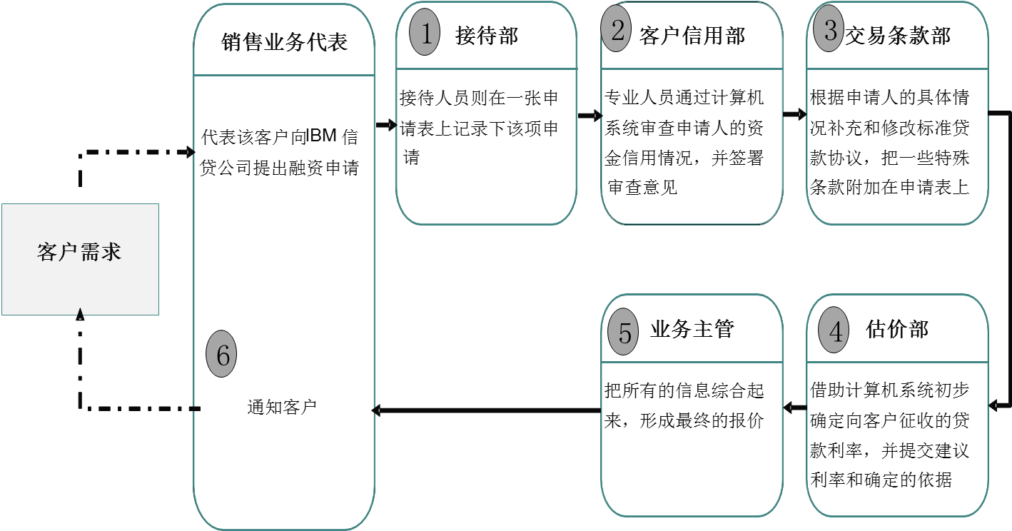IBM信贷公司是蓝色巨人IBM的全资子公司,坐落于美国康尼狄格州老格林威治市,其主要业务是为IBM计算机销售提供融资服务。这是一项绝对赚钱的买卖,向顾客的此类采购活动提供融资服务,金融风险很小。但是,这种小额信贷的经济效益则主要取决于人均业务量。刚开始,该公司的经营情况并不好。其早期的生产流程是按传统的劳动分工理论进行设计的,共包括6 步流程,具体过程如图3-6所示: