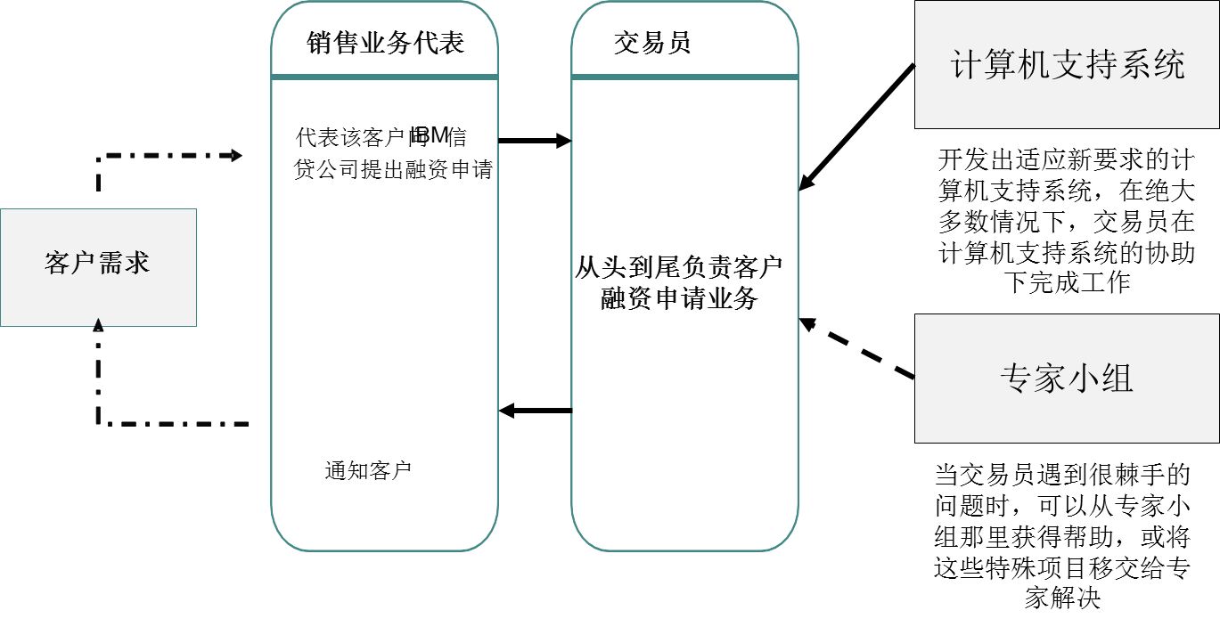 公司经过仔细调查发现,每位工作人员在处理分工业务范围内每份申请时,所需的时间都不长,一份申请整体的累计实际处理时间,即使加上各个部门重复花费在计算机系统输入和查询上的时间,总共也只需要90分钟。其他的时间都消耗在部门之间的表格传递和等待传递的搁置上。可以清楚地看出:问题不在于单一的任务和执行这些任务的工作人员,而在于过程本身。原先的流程设计建立在传统的劳动分工理论之上,并假定每一次交易请求既独特而又复杂,因而需要4个训练有素的专业人员分工进行处理。实际上,这种假设是错误的,因为大多数客户的贷款申请既简单而又直截了当。这一发现,使管理层关注整个贷款过程的核心问题,并进行更深人地思考,决心改变经营过程。最后,决定用熟悉多种业务的交易员取代信用信核员、定价员等专业人员。申请表不再从一个办公室送到另一个办公室,而是由交易员从头至尾负责全部工作,取消了申请表的多层传递。