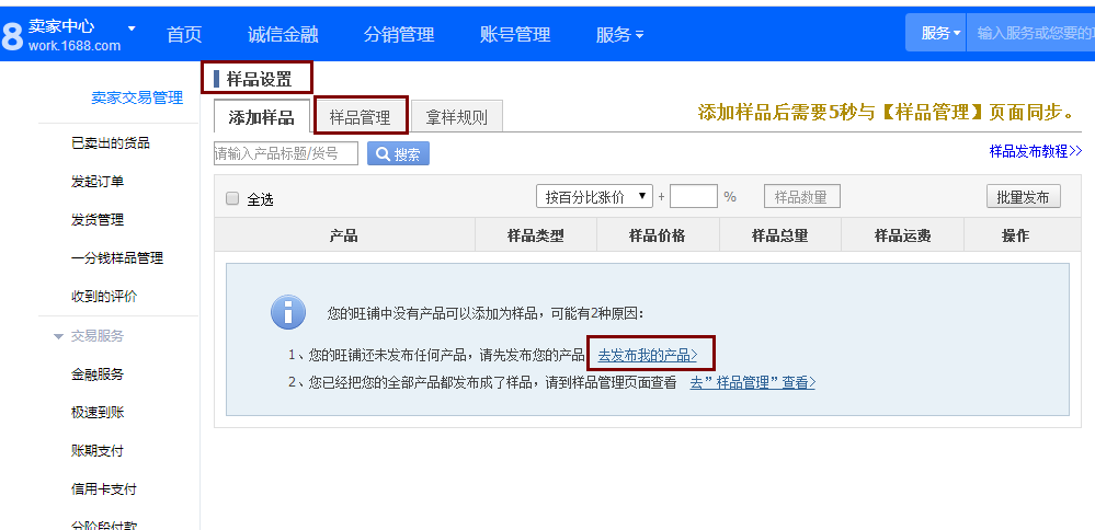 具体操作步骤为:我的阿里——卖家交易管理——样品设置——添加样品。如果有样品的就可以不用参加,可以在旁边的样品管理中看;如果没有样品的就需要再添加。如图12-29就是以上路径显示地址。