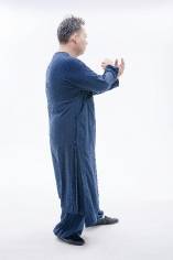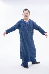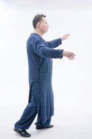 2.左脚底踩下送腰胯向左旋,带动右肩及右手掌向前送出,左手掌后迎,如暗含白蛇吐信式,为一细微小动作。左脚底再踩下,带动腰胯向左旋,同时双手松掉落于左胯旁,手心相对。