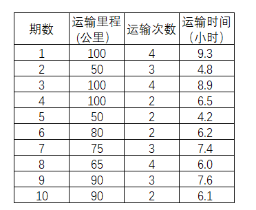 某物流公司进行一个运输作业项目,它执行了10回作业任务,每次具体的运输里程,运输次数和运输时间都留有记录。