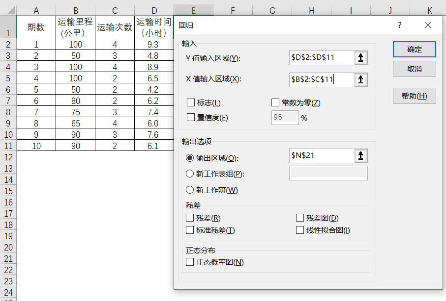 第11回作业估算要跑102公里,涉及6次运输次数,那么预测其所使用的时间,则可以考虑使用多元线性回归进行预测。因变量Y就是运输时间,是将要进行预测的项目,而自变量X就是运输次数和运输里程。根据这个通过Excel进行数据分析。
