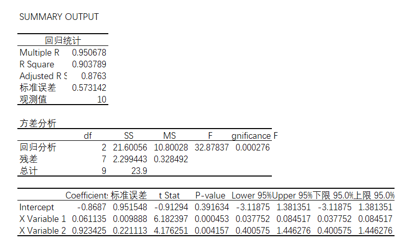 并且R值为0.95,具备很强的正相关性,而R平方值为0.903,意味着运输次数,运输里程可以解释运输时间的90.3%的变化原因,调整的R平方值为0.876。由此看来这个回归方程还是比较适合的。