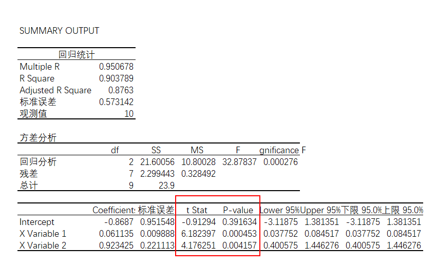 在上述例子中,进行回归的数据分析,得到多个t值和p值,在多元线性回归方程中,涉及多个变量的话,P值和t值有助于证明模型是否足够吻合线性模型。