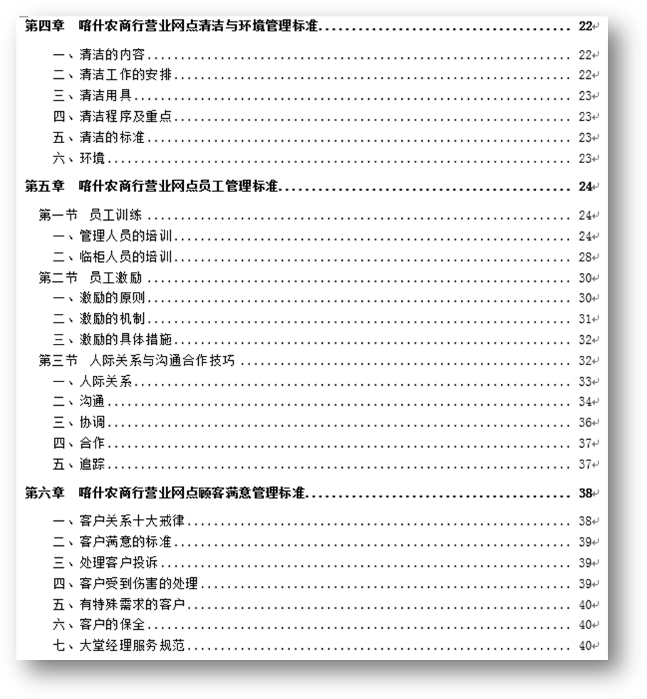 接下来还是给大家介绍一个实战的案例。笔者给喀什某银行做的《营业网点标准化管理手册》,仅目录就包含5章(如图1-5、图1-6所示),每章还有很多小节,最后花了大概三天的时间就完成了。