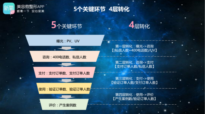 有了定价,还要有好的运营体系。新氧平台,有这样一个漏斗模型,五个关键环节,四种转化,每一层的数据,只要看到有问题,系统会有一个智能提示,医疗机构管理者就知道问题出现在哪。比如到店消费这一层转化率,跟其他机构相比是偏低的,系统会提示具体原因在哪里。
