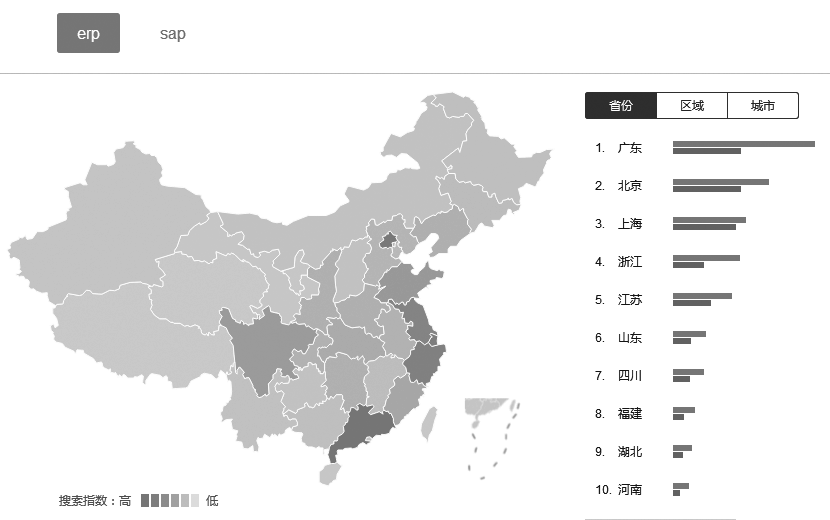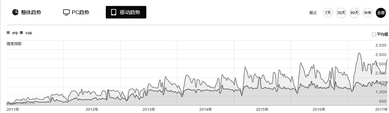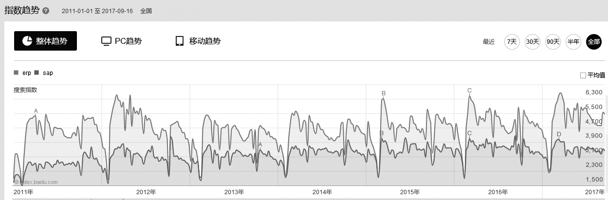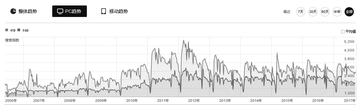我们仍然以ERP行业为研究对象,看看百度指数是如何使用的,之所以选择这个行业,一方面管理软件与每个企业都相关,另一方面我手头有大量的ERP行业客户(SAP公司的代理商们)可以佐证数据的真实有效性。