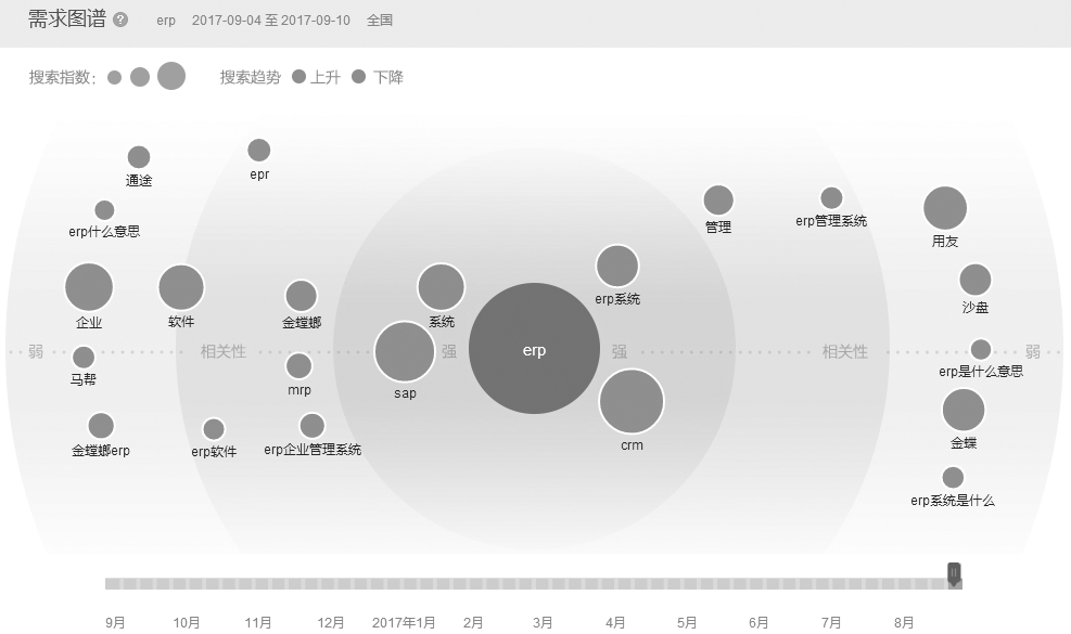 圆心就是ERP,每个与ERP相关的词都有一个圆,圆的大小代表着该词搜索量的大小,离圆心越近意味着与ERP相关度越高,越远相关度越低。图7-4最下方的时间调节器可用来查看一段时间的图谱,默认是一周的图谱。该图谱对于关键词在各平台上的推广都有一定的参考价值。
