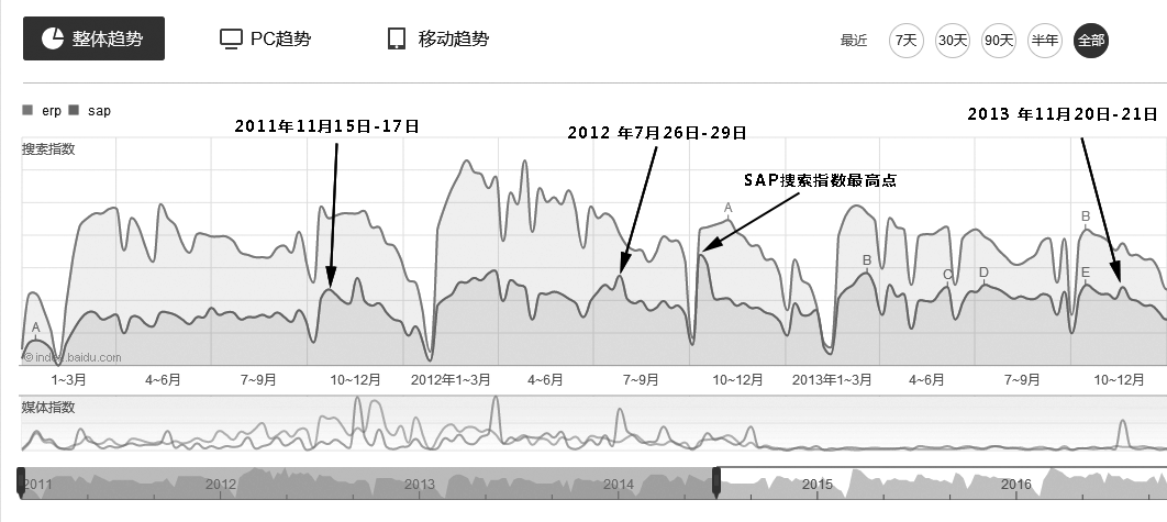 通过这些当时的热度新闻也能看出ERP行业哪些新闻媒体更重要,同样你也可以找到自己行业的重要新闻媒体。大家会注意到,自2013年起,ERP行业的媒体指数一直很低迷,除了2013年SAP同略会前后有一个新闻热点,再就是2016年I点和J点新闻引起的小热点,其他时间点很少引起新闻媒体关注。一方面,说明SAP公司在新闻宣传方面的投入减少;另一方面,说明ERP行业日渐成熟,发生事件很少引起媒体热炒。