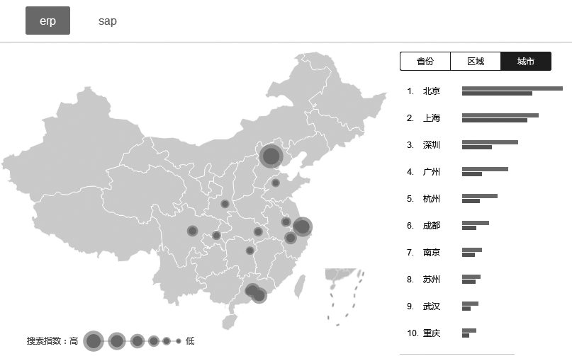图7-9与图7-8明显的区别在于,按大区统计时,华东地区比华南地区用户数高出一倍,而且华东和华北地区的SAP关注度高于ERP。在做广告预算时,需要加大这两个大区的投入,特别是与SAP相关词的投入。