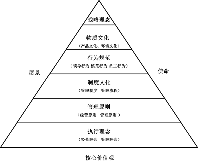 源于此,我把“核心价值观、愿景和使命”定义为企业文化的“金三角”。并由此延伸,创建了企业文化的“银三角”、“铁三角”,最终形成了一套全新的企业文化“金字塔”系统理论。企业文化管理者的所有工作只需围绕着“金三角”一一展开,自然会缔造出支持企业基业长青的企业文化“金字塔”。
