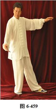 右撵:含腰右转,左掌向后偏左弧形抬至略高于肩。左臂外旋掌心朝上,眼神观注左掌后举;随即含胸提腰微拱,右膝提起,右脚后撤一步,身体渐渐右转,重心渐渐移至右腿。右脚踏实,脚尖稍朝向东南,左脚尖随即移向正东;随转体,右掌弧形后撤回收至右胯旁,左掌弧形向前向上推出。眼神随转体向前平视转移,并观之前推之掌(见图6-458至6-459)。