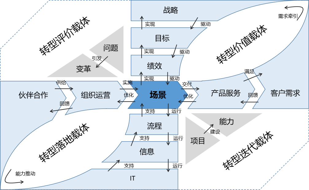 数字场景作为企业数字化转型价值载体、落地载体、评价载体、迭代载体,向上支撑组织绩效、业务目标、企业战略的实现,向下深化流程、信息和企业IT的优化变革,向前助力产品服务、客户需求的交付,向后拉动组织运营、融合伙伴的能力,是战略落地、技术升级、客户满意、运营优化的共同落脚点,如图3.6所示。