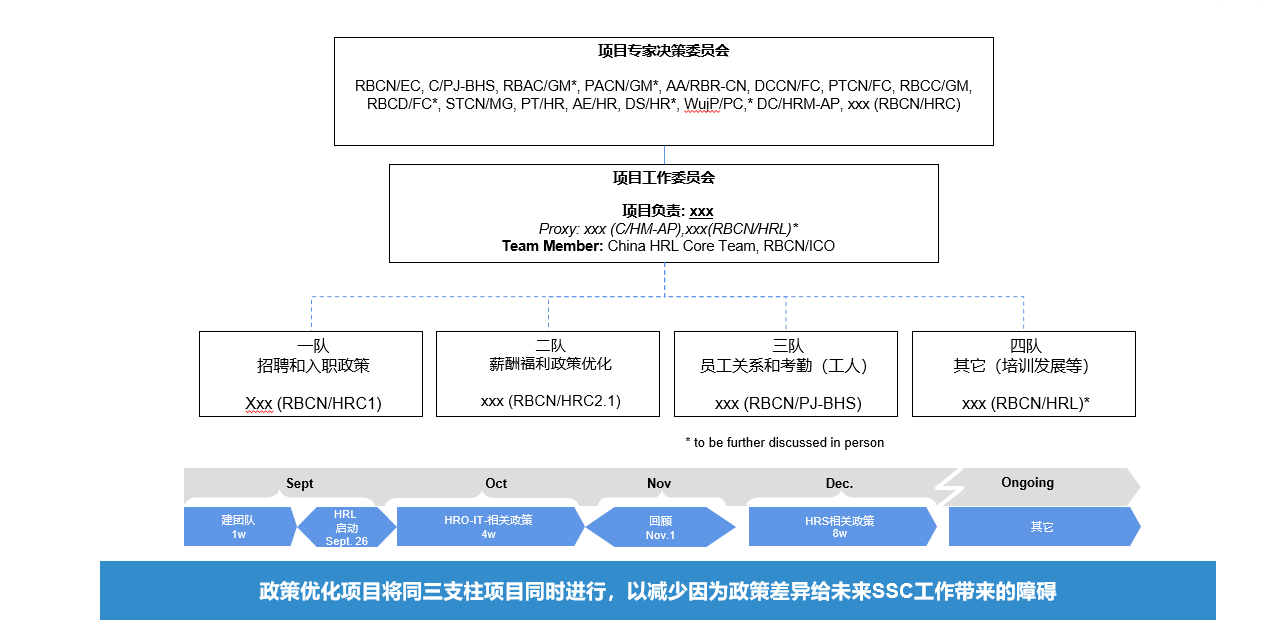 这里的决策委员会,原则上可以同项目组的决策委员会是同一个委员会。只是在项目阶段会议的时候把政策优化相关的进程和决议在会上讨论即可。在整个案例中,之所以成立独立的组织架构,主要的项目计划开始没有把政策梳理考虑进去的失误造成的。当组织项目的组织设计和流程设计推进时,发现很多公司的政策不一致,于是立即成立了项目组。