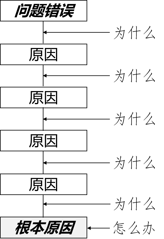 原因分析:找到问题背后流程设计存在的缺陷,从流程设计层面进行彻底地解决。原因分析的方法可以采取经典的5W法,即连问5个为什么。这里的5个是泛指, 也许少于5个,也许多于5个,要一直追到管理体系要素层面,即流程、组织、人才/能力、绩效/机制、工具/IT、策略为止。将大致的逻辑阐述如下: