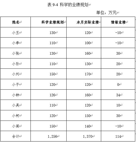 举例:A企业对销售部门员工进行业绩考核,销售部门共有10名员工,每名员工月度业绩考核为100万元。作为销冠的小王,这个月的业绩突然从200万元下滑至30万元。分析原因得知,小王的父母最近身体不好,小王平时看重业绩,无暇顾及父母的身体,这次父母病重,让小王深感内疚,所以业绩下降了170万元。小王因自己情绪的变化而导致企业的本月收入降低170万元。根据表9-3,累计74万元的业绩损失最终由管理者承担。