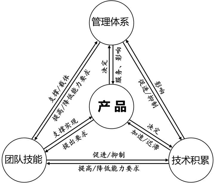 产品、团队技能、技术积累和管理体系构成了完整的研发体系,但是它们在体系中的地位并不相同。其中: