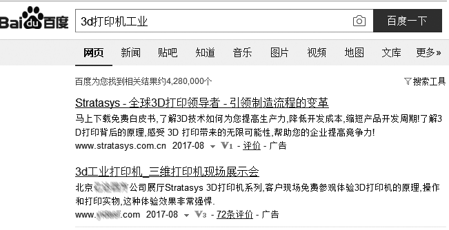 图3-62就是我刚才点击广告进入网站的访问记录,用鼠标放在【搜索推广】位置,看到的是一条搜索某关键词的结果(s?wd=这几个字符的意思是搜索的关键词,后面一串字符是“3d打印机工业”汉字的计算机代码),完全跟正常的搜索结果一模一样,看不到任何网盟的痕迹。