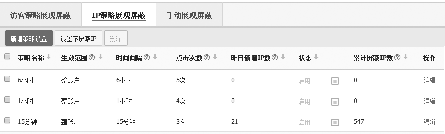 【策略设置】:这是百度简单的自动屏蔽功能,当在指定的时间内广告被同一IP或者访客连续点击多次,就自动屏蔽该IP或者访客识别码,如图3-65所示。百度有三个时间段设置:15分钟、1小时、6小时,我一般设置为3次、4次和5次。