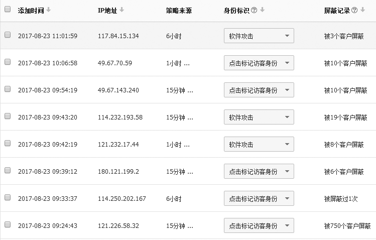 由图3-65看出,主要屏蔽的恶意点击是15分钟档,一天屏蔽了21个IP。当然也会有错判的,因为计算机无法识别这个多点者是否认真看了网页并联系业务,如果发现有错判的,可以在【设置不屏蔽IP】按键中纠正。图3-66是部分屏蔽的IP,多数屏蔽的IP也被其他推广企业所屏蔽,特别是最后一条竟然被750个客户屏蔽。
