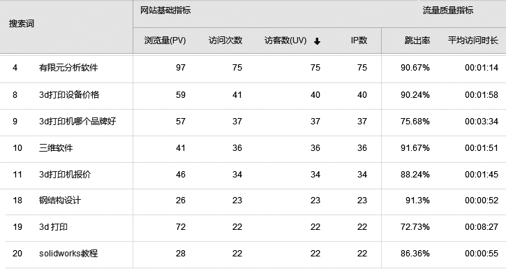 一般情况下,我们认为跳失率比较高、平均访问时长比较短的搜索词被恶意点击的嫌疑比较大。所以,第4、第8、第10、第18条对应的搜索词(有限元分析软件、3d打印设备价格、三维软件、钢结构设计)需要进一步分析。我们调出了半年来所有咨询过的客户记录,以“钢结构设计”这个词为例,半年来没有客户通过搜索该词来咨询,但相关的咨询是有。记录显示半年以来,客户是在360上自然搜索“safi钢结构分析软件教程”,在百度上自然搜索“钢结构楼梯设计软件”后洽谈业务的,独独没有搜索“钢结构设计”这个词来咨询的,哪怕是无效咨询都没有,所以我们就可以判定该词遭到恶意点击。