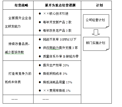 如前所述,企业经营方针规划阶段的核心输出是企业经营战略,而经营战略必须展开为可操作、可实施的经营课题。如果经营战略不能有效地展开为经营课题,没有具体的实施计划和有效的措施,经营策略的成功只是一句空谈。