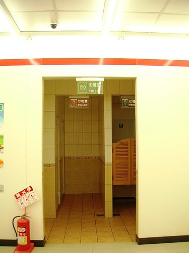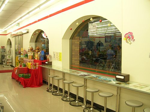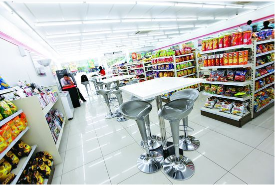 为了防止分散消费者对商品的视觉注意力,便利店内部的装潢没有采用鲜艳的色彩,“天、地、墙”都采用反光性、衬托性强的纯白色,给人以整洁、干净的感觉。便利店全部采用齐胸高的开放式货架,便于消费者寻找所需的商品。在某些空间稍大的便利店里,还提供一定数量的座椅,方便消费者在店内用餐,部分门店还设有卫生间供消费者使用。如图3-9、3-10所示。