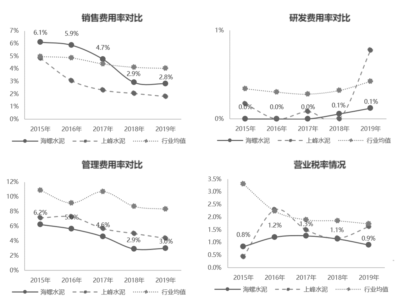 海螺水泥、上峰水泥、水泥制造行业在2015—2019年的各费用率情况如图8-33所示。