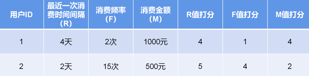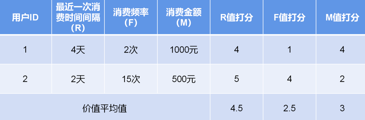 通过对R、F、M三个数值进行打分之后,我们就需要来计算出这3列的平均值。如表3-5所示。