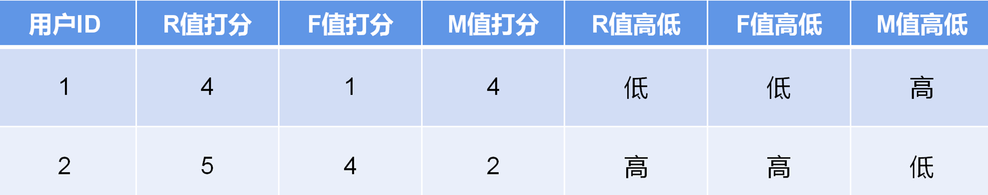 根据价值平均值,分别记录R、F、M三个值是高于平均值还是低于平均值。如果R值高于平均值,则记录为“高”,反之则记录为“低”。如表3-6所示。