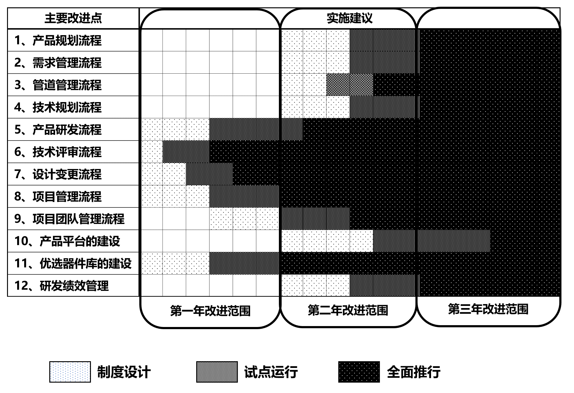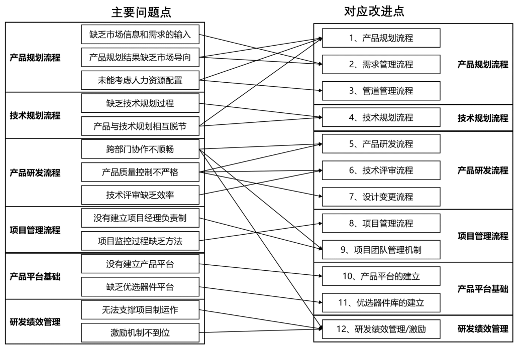 在产品研发层面,针对典型的产品研发流程,着力解决跨部门协同关系,同时改善项目管理机制,提高研发流程和研发项目的运作效率;