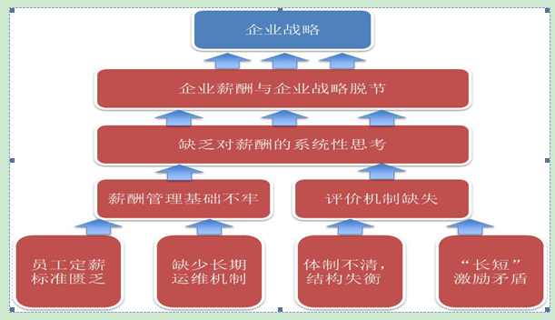 1.企业薪酬与企业战略脱节。薪酬管理没有成为企业吸引、留住人才的支撑点,导致核心人才频繁跳槽,员工缺乏工作与晋升动力,薪酬策略导向没有与基于战略的员工队伍建设相结合,无法形成人力资源核心竞争能力。