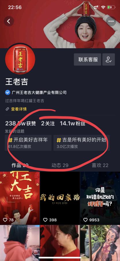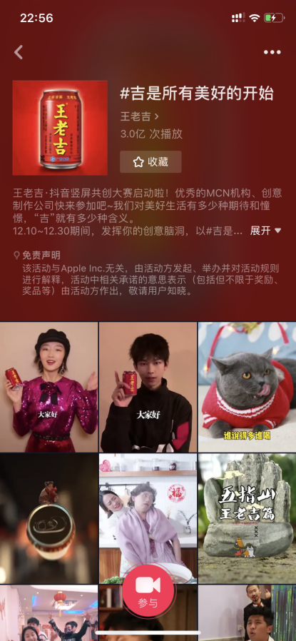 “热门话题”是传播性极强的工具,认证后的账号具备“发起话题”功能。如图4-26所示,王老吉在自己的抖音号上发起“吉是所有美好的开始”话题活动:参与者在规定时间内,以这句话为主题发布视频,共同传播发起话题视频PK。所有发布的视频,都会添加话题“#吉是所有美好的开始”。观众点击话题,可以进入到话题总页面。截至2019年3月5号,本话题的视频总播放量高达3亿次。王老吉品牌虽然进花费了很低的成本,却得到了海量的传播。