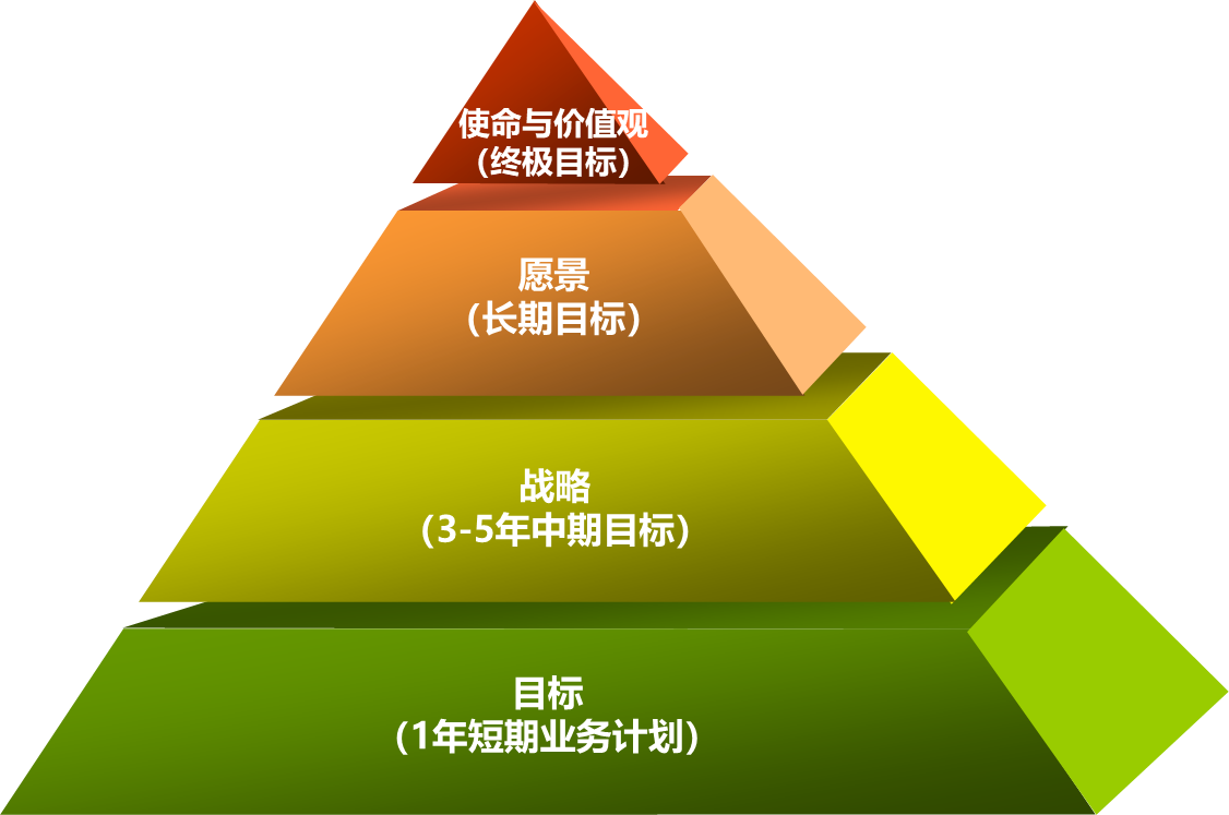 在第三章第二节中,我们曾讨论过BLM所定义的战略意图,主要包括使命、愿景、核心价值观、战略和目标这五大方面。战略解码阶段的解目标其实就是将企业使命(终极目标)分解为愿景(长期目标),再分解为战略(中期目标),然后进一步细化为1年期业务计划(短期目标)的过程,如图4-2所示。