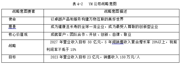YM公司是国内专注于智能物联某细分市场领域的高新科技公司。该公司的战略规划团队在2022年10月份,依据BLM输出了公司的战略意图,见表4-2。
