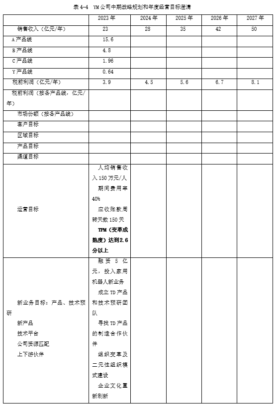 经过战略规划小组和解码小组的多次研讨,最终两个团队达成了共识,形成了YM公司中期战略规划和年度经营目标澄清,见表4-4。