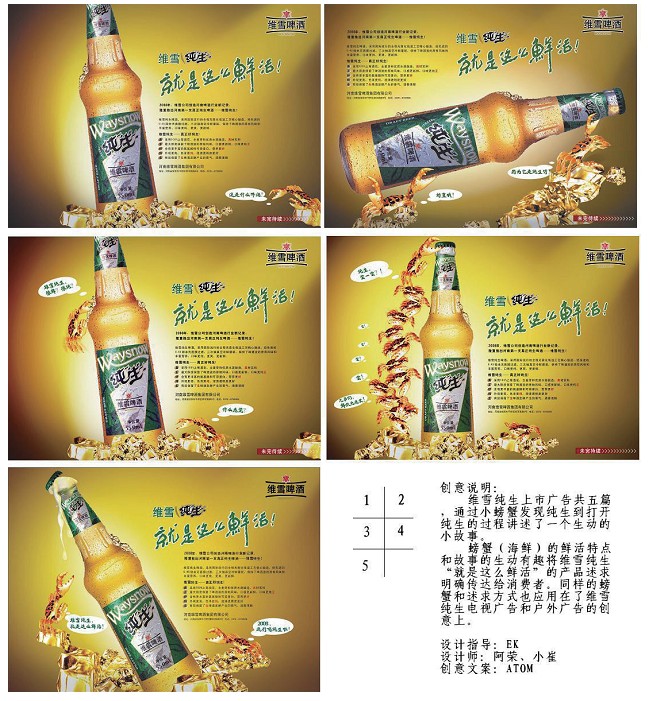 维雪纯生广告分为五个篇章,讲述了一个小螃蟹发现纯生到打开纯生的生动、活泼的小故事,螃蟹(海鲜)给人的鲜活感受和故事的生动有趣将维雪纯生“就是这么鲜活”的产品诉求明确表达给消费者,同样的创意表达方式也应用在了维雪电视和户外广告上。